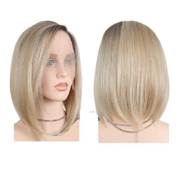 Γυναικεία περούκα Full lace 13×4 (αόρατη εφαρμογή) σε ξανθό gold με καστανή ρίζα χρώμα συνθετική υψηλής ποιότητας Kanekalon τρίχα 12 inches