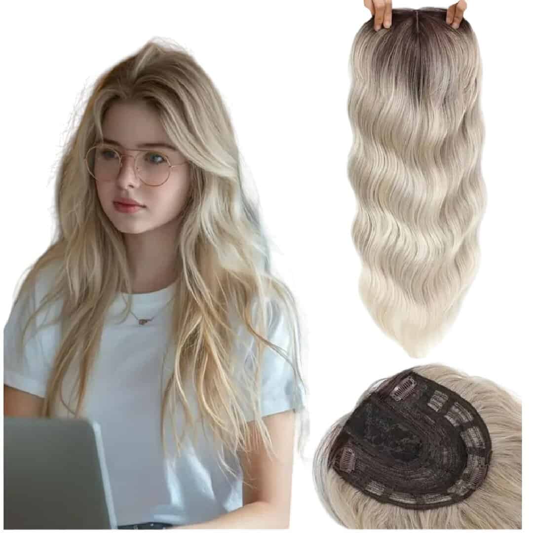 Γυναικείο Topper Τουπέ κορυφής μαλλιών με κλιπ μεγάλης επιφάνειας και Lace Front (ραμμένο σε διαφάνεια) – Ξανθό Σαντρέ ashy blonde wavy 18 inches