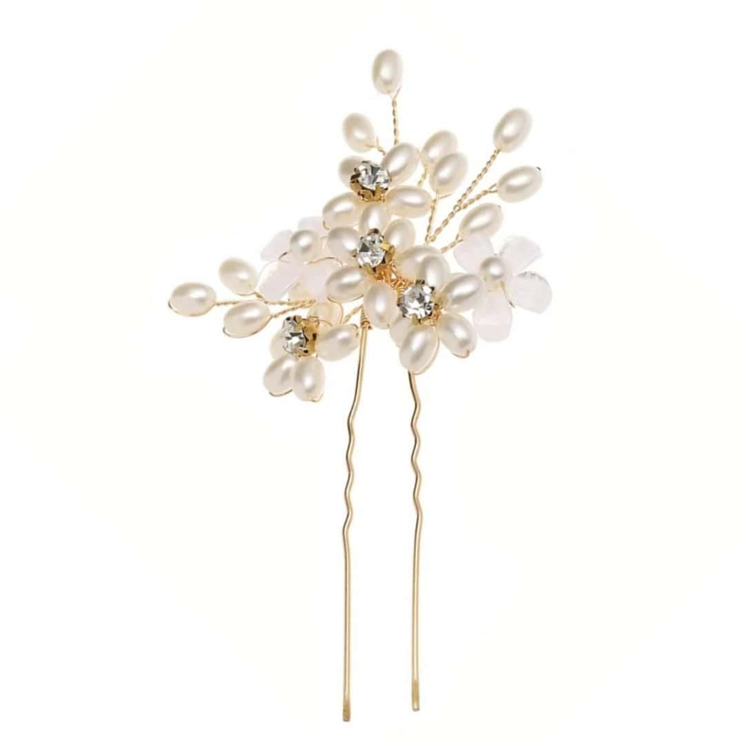Νυφική φουρκέτα με πέρλες και λευκά λουλούδια σε χρυσό χρώμα