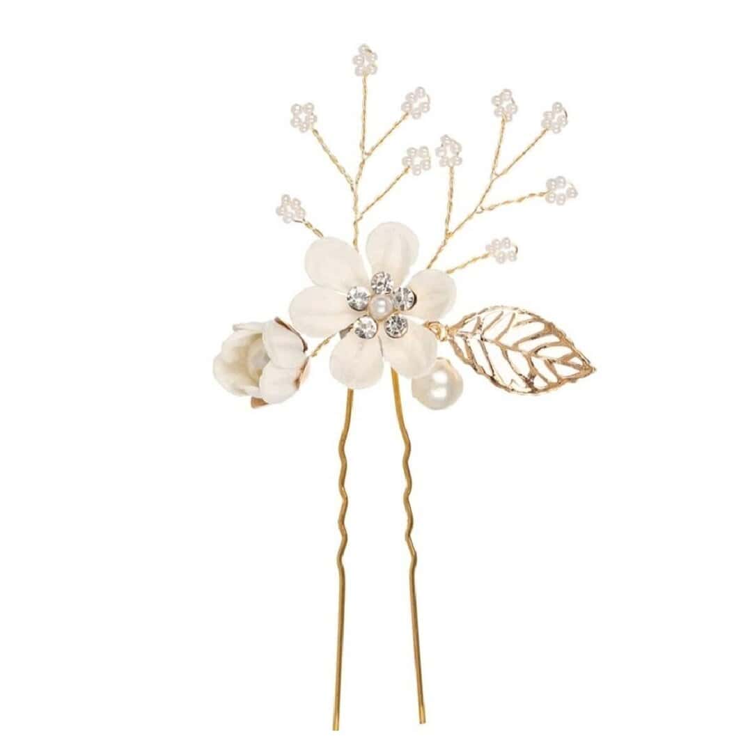 Νυφική φουρκέτα με πέρλες και λευκό λουλούδι με φύλλο σε χρυσό χρώμα