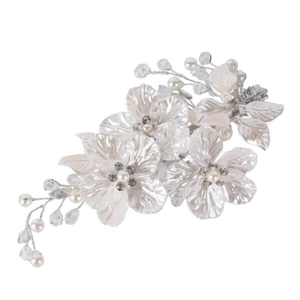 Νυφικό κλιπ με λευκά λουλούδια σε ασημί χρώμα με κρυσταλλάκια 15cm