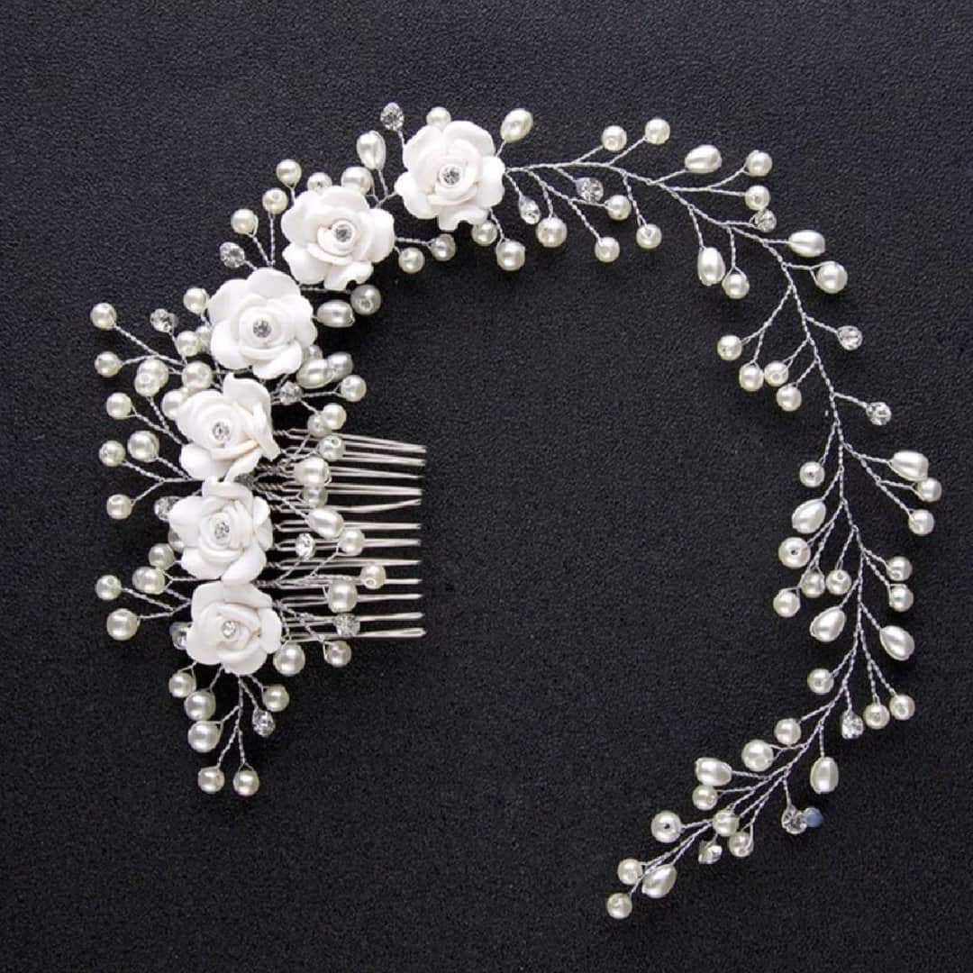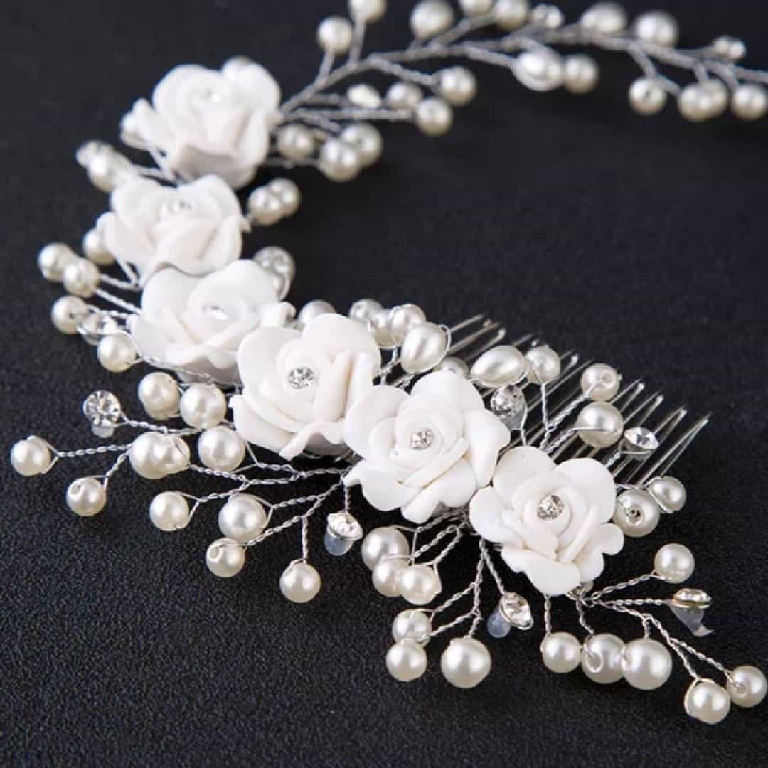 Νυφικό μεγάλο χτενάκι με ουρά λευκά λουλούδια πέρλες και στρας 30cm
