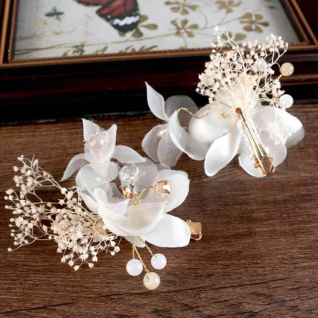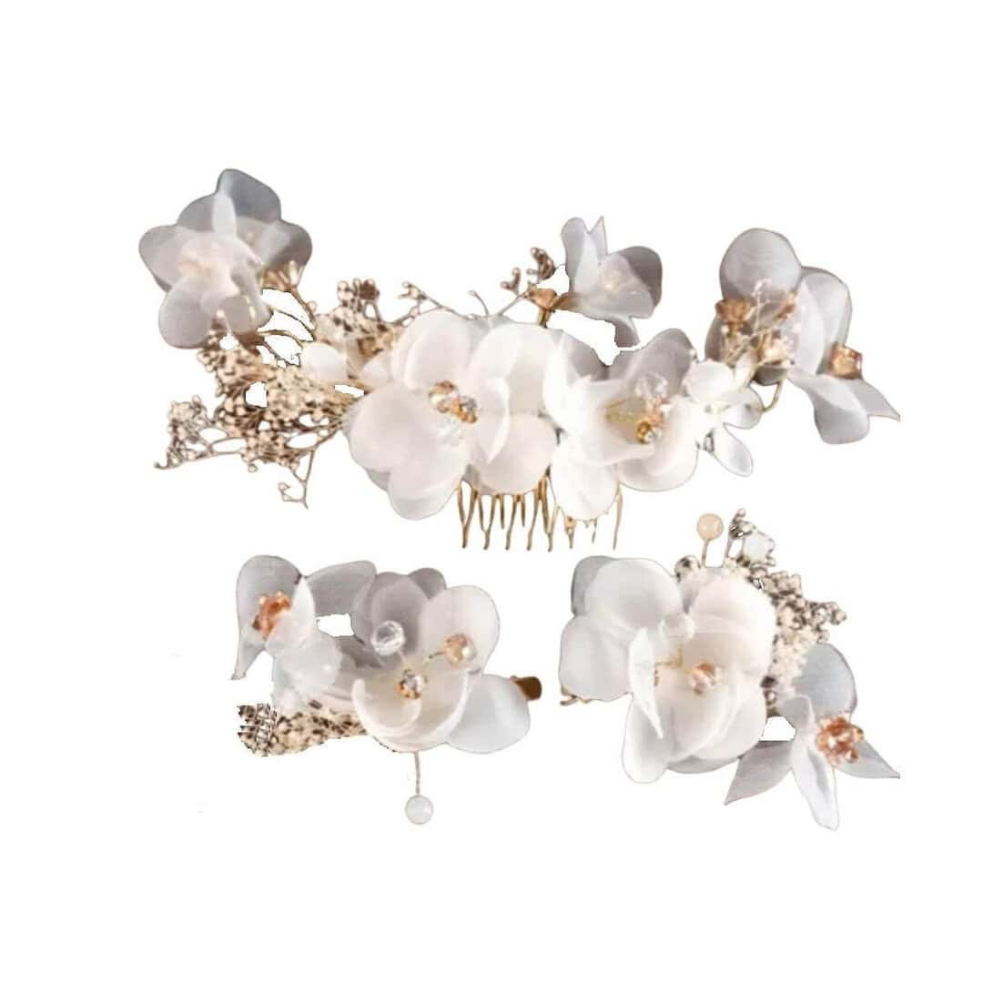 Νυφικό Σετ χτενάκι λουλουδιών σε χρυσό χρώμα 25cm + 2 κλιπ για παρανυφάκια 12cm με αποξηραμένα λουλουδάκια