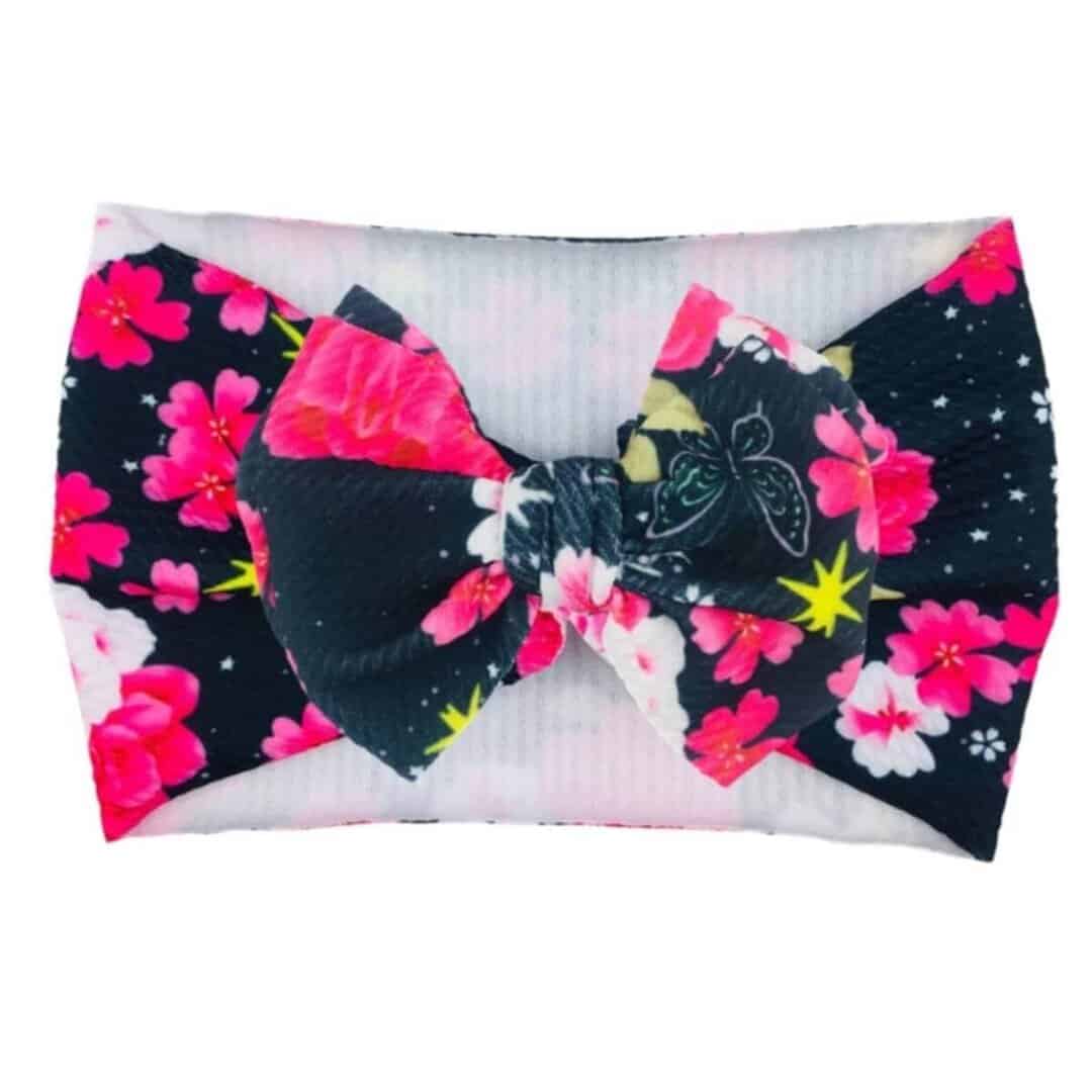 Παιδική- Βρεφική Μαλακή κορδέλα μαλλιών με μεγάλο φιόγκο 5 μηνών-7χρονών waffle- Black Flowers