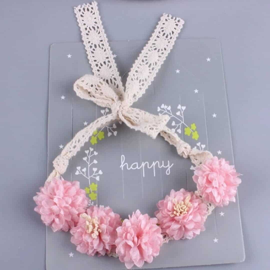 Παιδικό-βρεφικό Ροζ στεφάνι-κορδέλα λουλουδιών με δαντέλα για βάφτιση και παρανυφάκι