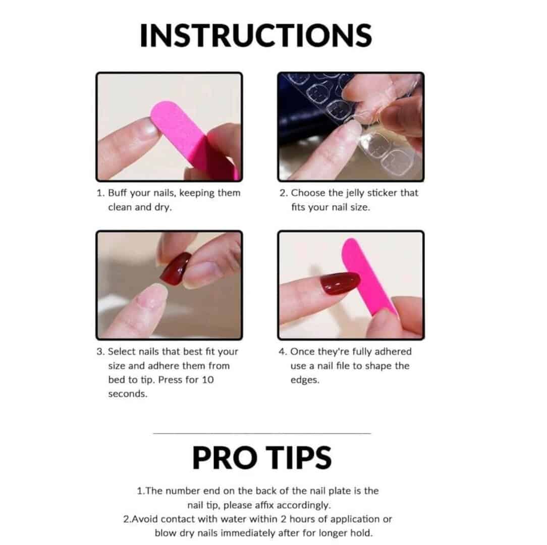 Διαθέτει 24 τμχ νυχιών και κόλλα για τοποθέτηση , 1 λίμα και αυτοκόλλητα τοποθέτησης