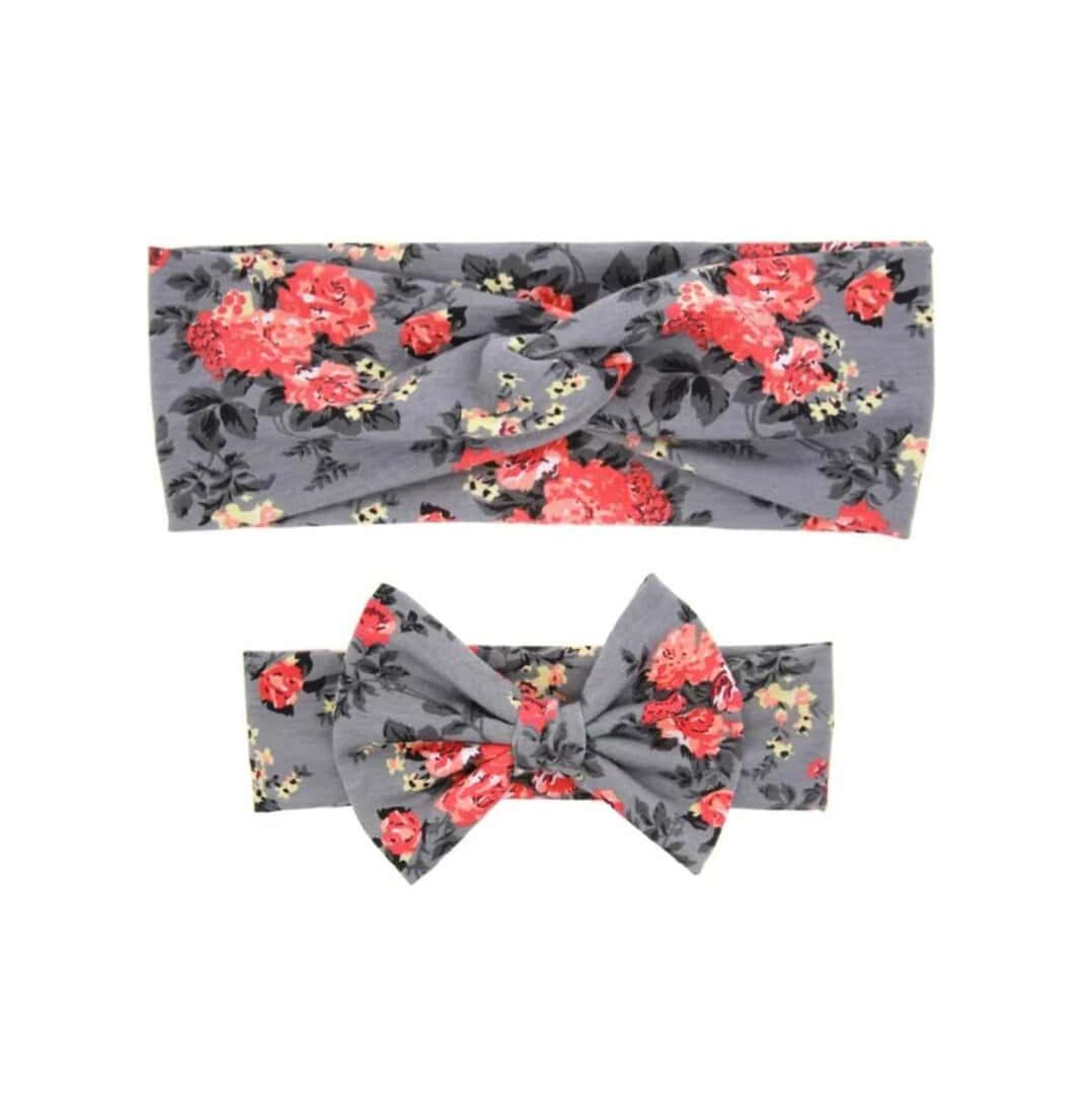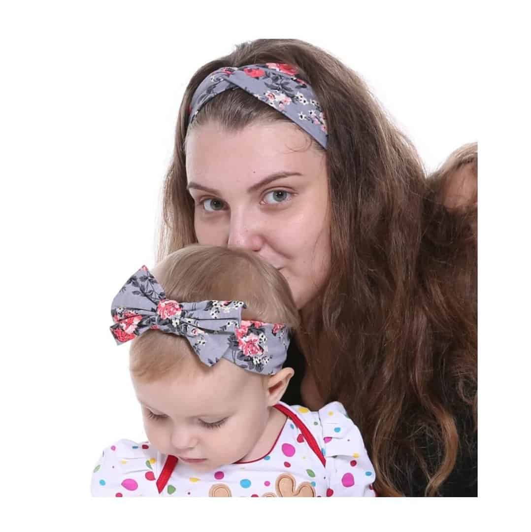 Σετ Μαμά- Κόρη Μαλακή κορδέλα μαλλιών Grey Flowers 0-3 χρονών