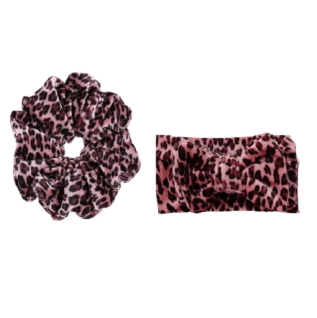 Σετ Μαμά-Κόρη xlarge βελούδινο scuncie και παιδική-βρεφική κορδέλα leopard pink 0-8 χρονών