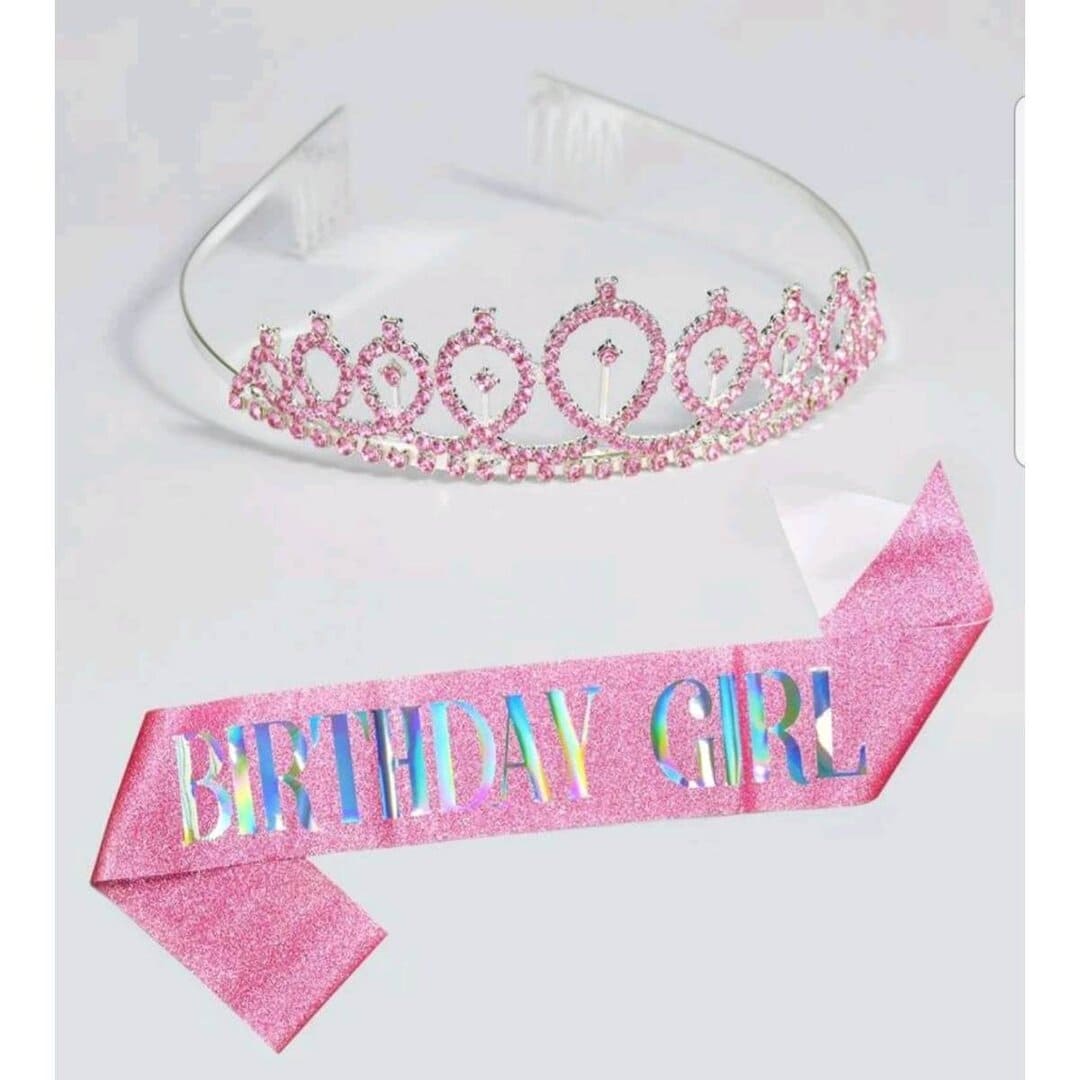 Σετ Μεταλλική Κορώνα Πάρτυ Γενεθλίων με κρυσταλλάκια και κορδέλα Birthday Girl Pink