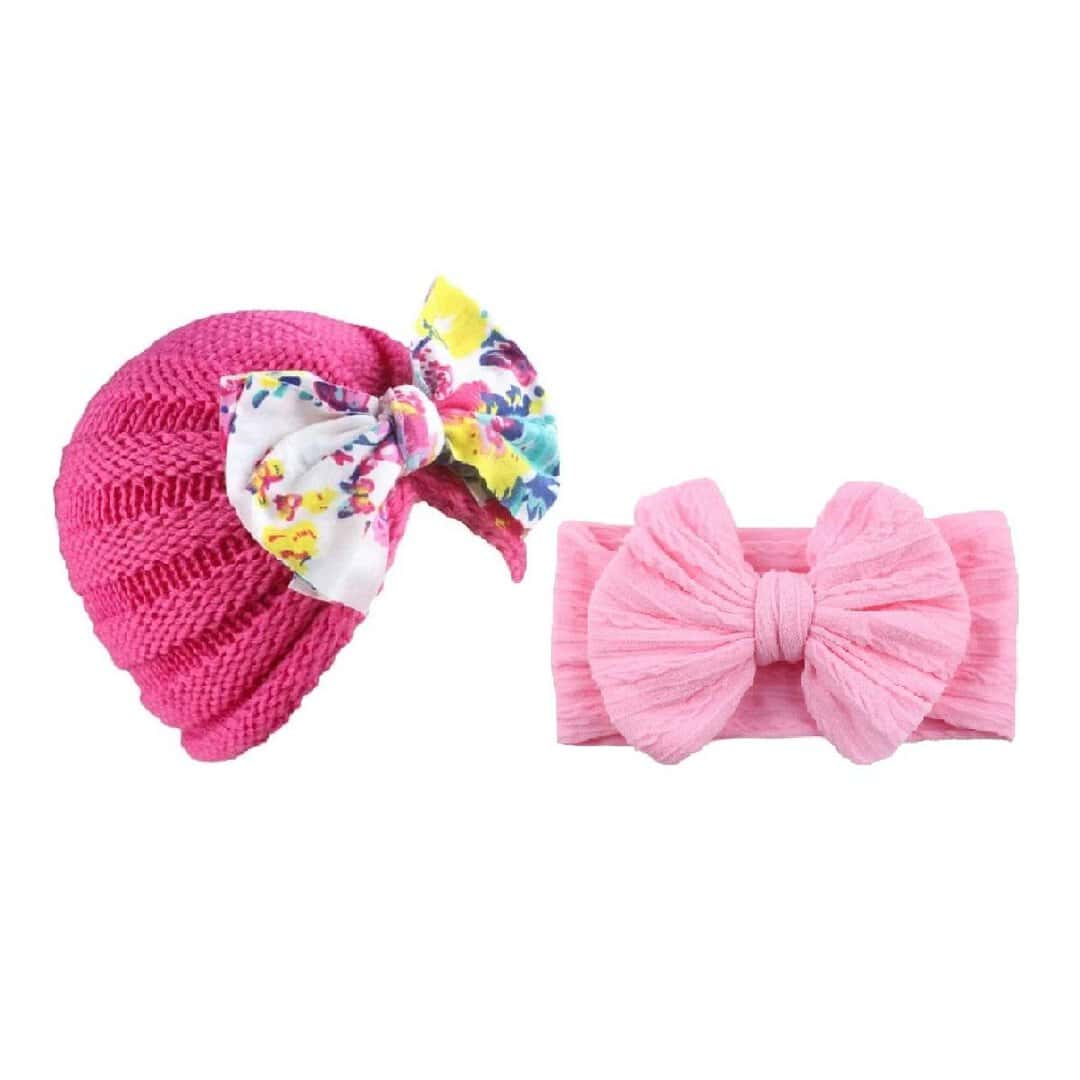 Σετ Πλεκτό μάλλινο σκουφάκι με φιόγκο 10cm για ηλικία 0-5 χρονών – Pink + κορδέλα rib 0-8 χρονών Pink