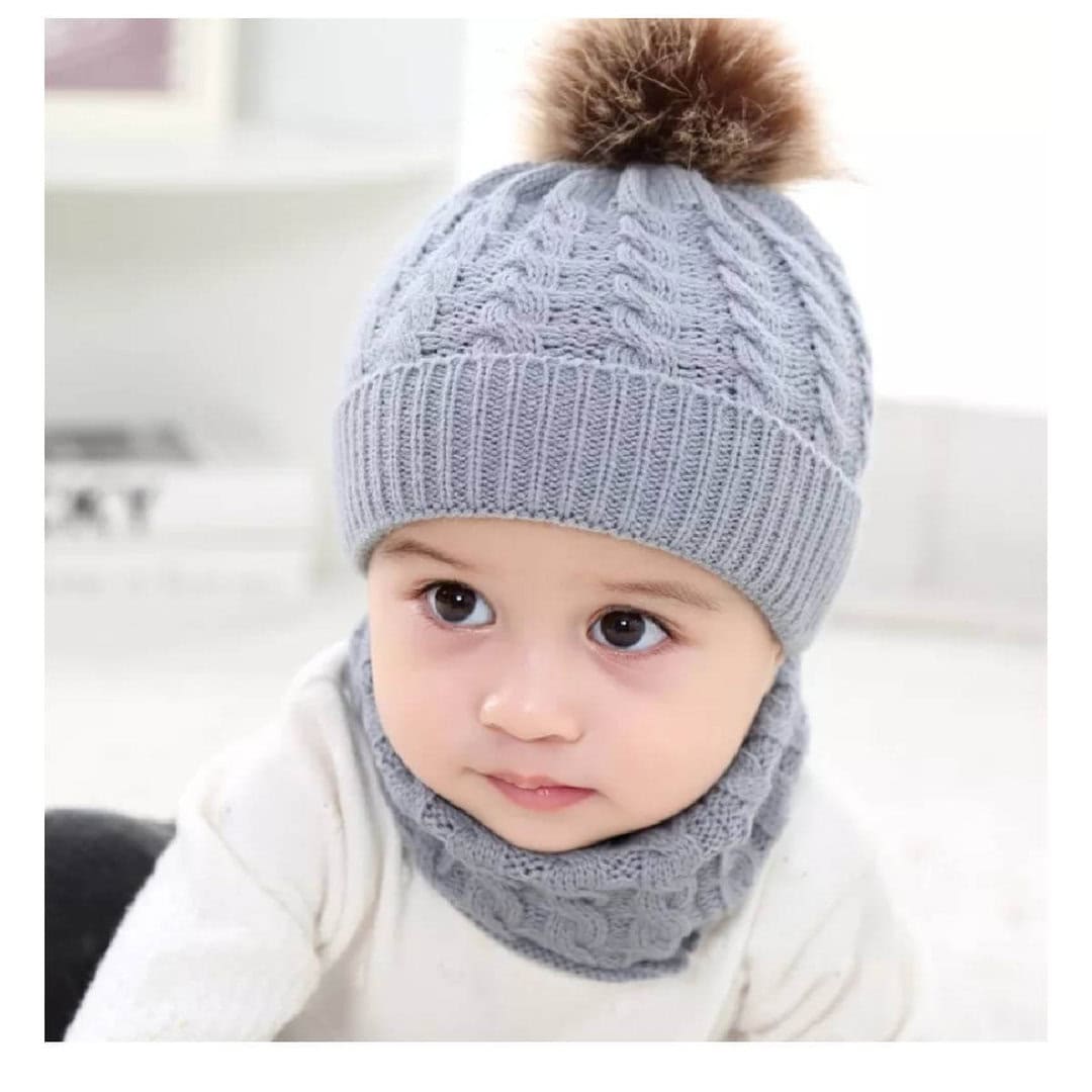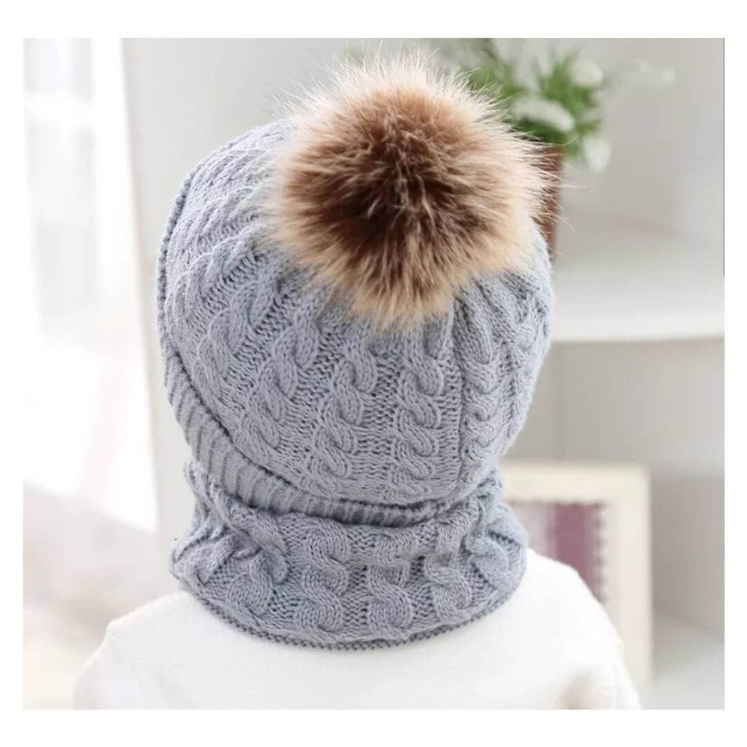 Σετ Πλεκτό μάλλινο σκουφάκι με φούντα + κασκόλ για ηλικία 0-10 χρονών Grey